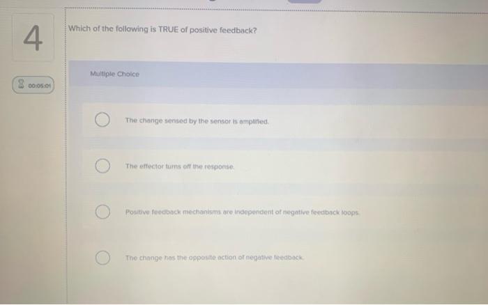 It exhibits a cascading effect cit exaggerate the original stimulus d. Which of the following is true of positive feedback mechanisms. Multiple Choice 000501 The change sensed by the sensor is amplified The effector turns of the response Positive feedback mechanisms are independent of negative feedback loops The change has the opposite action of negative feedback.